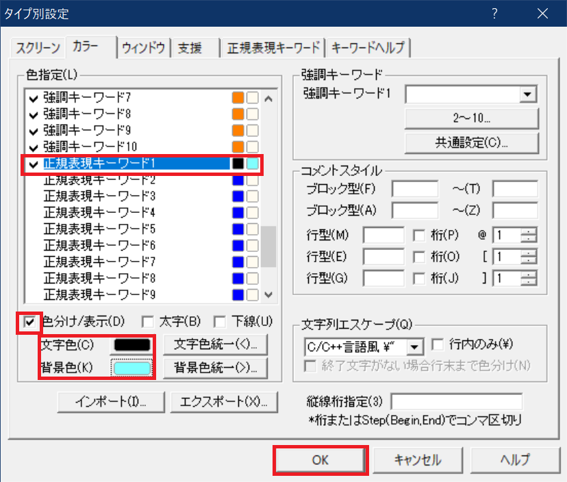 ③次に[カラー]タブを開き、色指定「正規表現キーワード1」を一覧から選択し、[色分け/表示]にチェックをします。