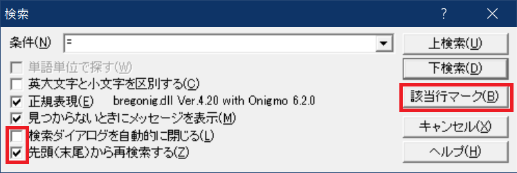※個人的には、検索ダイアログを自動的に閉じるのチェックを外し、先頭(末尾)から再検索するにチェックをいれるのがおすすめ。