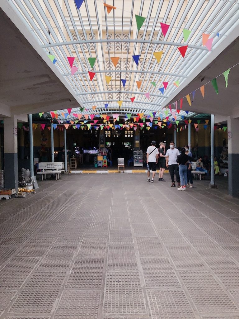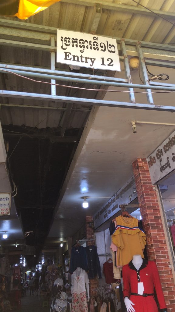 市場はロシアンマーケット、セントラルマーケットと呼ばれる大きいエリアが2か所あり、どちらも似たような感じです。かなり広く、景色も似ているため、複数人できて各々好きに買い物をしていると迷子になります。下の写真のようにストリートごとに番号が付いているので、何番と何番の交差点とか、何番の入り口とかで連絡をとりあって集合してました。