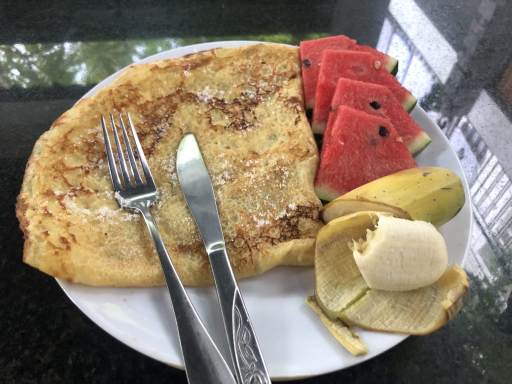 朝食は受付でお金を払うと、バイトっぽい女性が作ってくれます。果物いっぱいのパンケーキを注文。安いしお腹も膨れます。カンボジアはチップを要求されることは殆どないですが、美味しかったらお気持ちチップを渡しておくといいかもしれません。